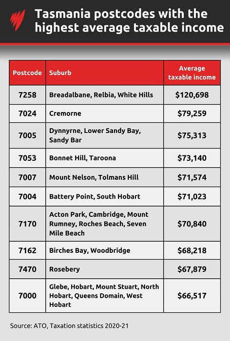 جدول کدپستی‌ها در تاسمانی با بیش‌ترین میانگین درآمد مشمول مالیات