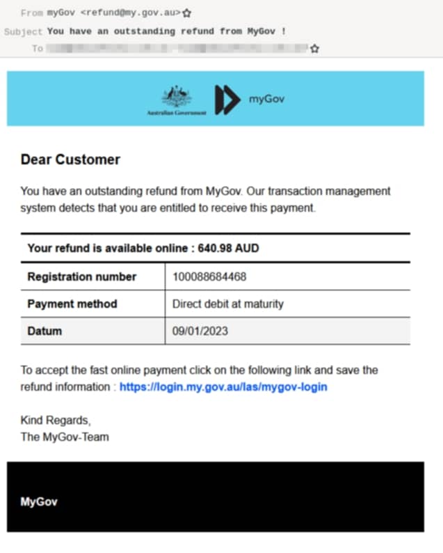 سرویس استرالیا(Services Australia) با انتشار بیانیهای اعلام کرد، هرگز پیام ایمیل حاوی پیوندهایی که کاربران را برای دسترسی به حساب کاربری در myGovراهنمایی کند، ارسال نشده است. به علاوه در ایمیلهای ارسالی از طرف این نهاد، اطلاعات شخصی و محرمانه درخواست نمیشود.