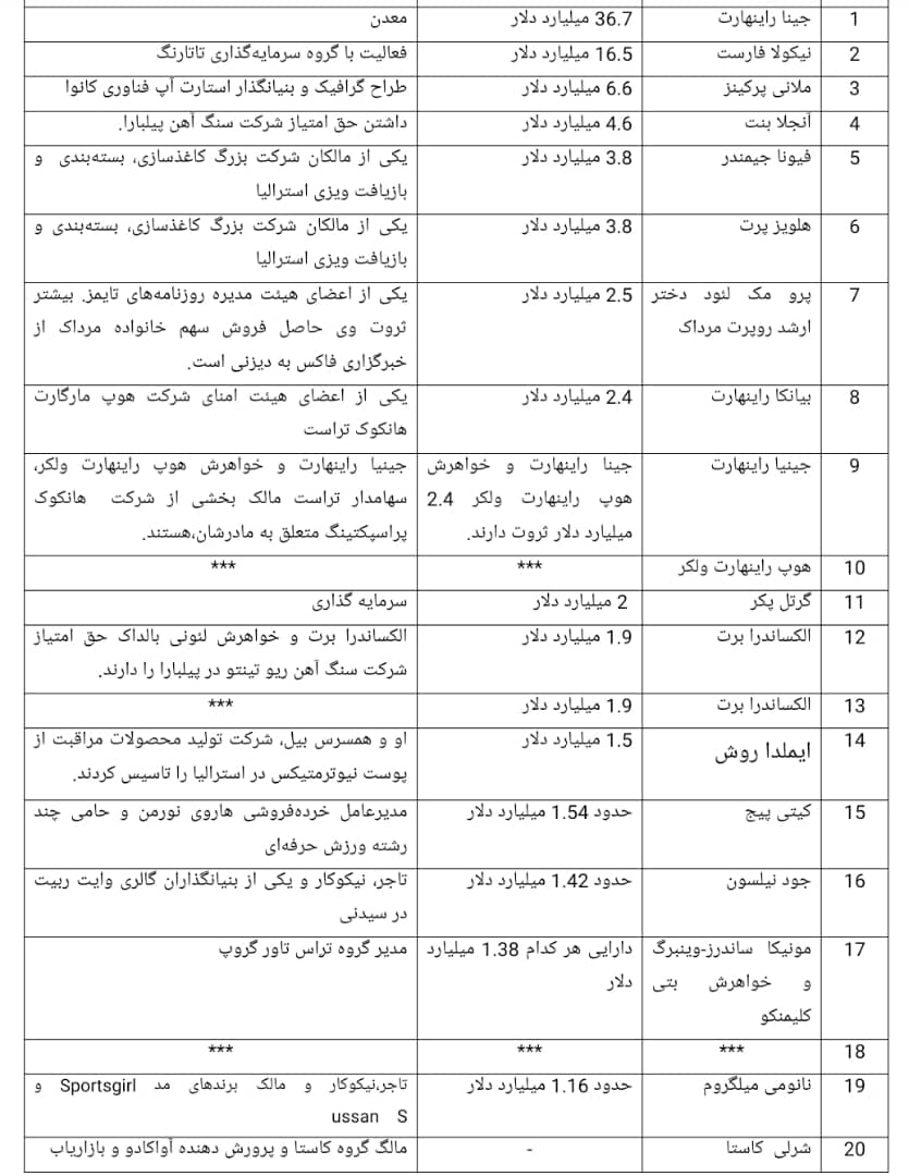 به گزارش رادیونشاط، 20 زن ثروتمند استرالیا در سال 2023 در مجموع دارایی بیش 100 میلیارد دلار در اختیار دارند.